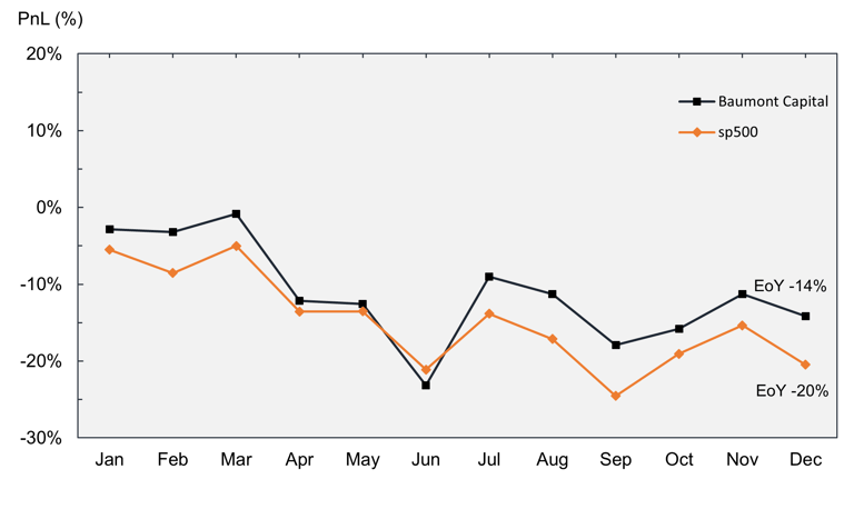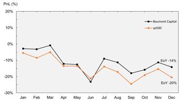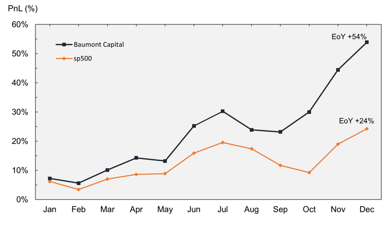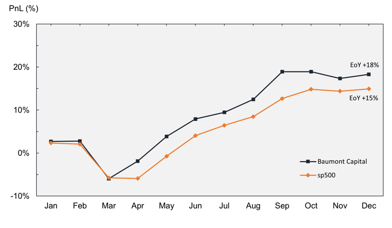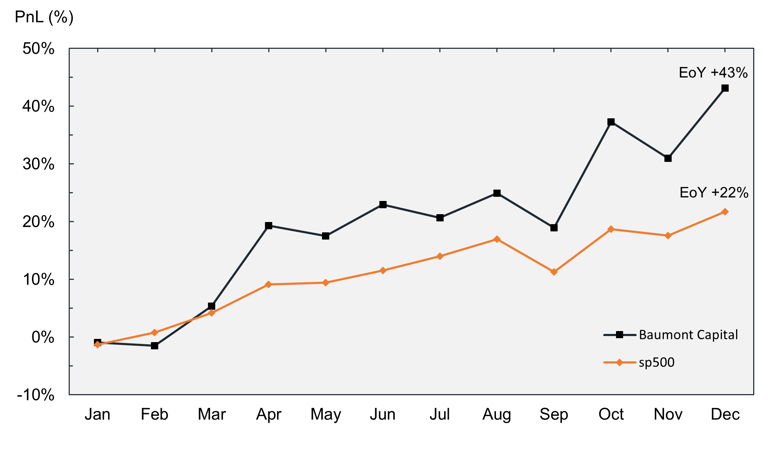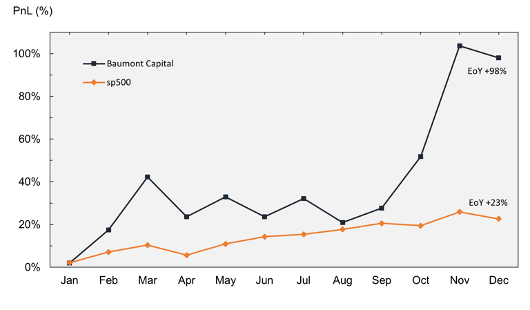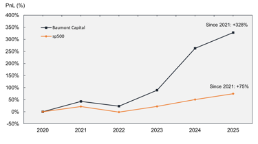 As illustrated below, our objective is to outperform major benchmark indices over time such as the S&P500® or Nasdaq®. The performance shown reflects trading results achieved by the founder using personal funds prior to managing external client assets with Baumont Capital LLC.