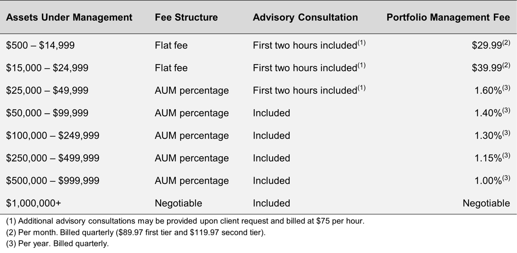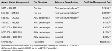 For accounts below $25,000, flat monthly fees apply and represent the minimum fees for portfolio management services.